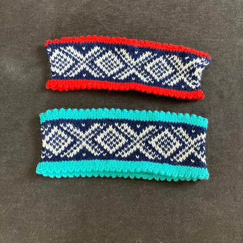 Håndstrikket pannebånd med kaninmønster i flere farger. Pannebåndene har bunnfarge i blant annet hvit og gul, med kontrastfargede kaniner i blå, rød, lilla og grå toner. Strikket i mykt garn som egner seg til bruk på kjølige dager. Passer til både barn og voksne, avhengig av hodeomkrets. Kan brukes som tilbehør til hverdags eller uteaktiviteter for å holde ørene varme.