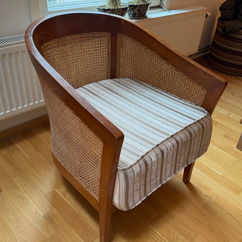 Pent brukt kurvstol. Komfortabel. Skinn-pute følger med. Hentes i Trondheim-området