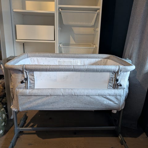 Kinderkraft bedside crib for spedbarn. Sengen har grå tekstiltrekk og nettingfelt på siden som gir innsyn og lufting. Den står på metallramme med justerbare ben og festestropper for å kunne sikres til voksenseng. Innvendig er det polstret kant og madrass med avtagbart trekk. Egnet som babyseng ved siden av foreldreseng de første månedene.