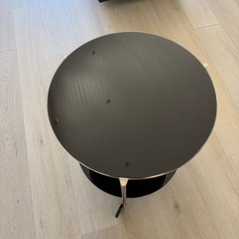 Selger et svart, lavt og rundt bord. Noen bruksmerker, se bilder.
