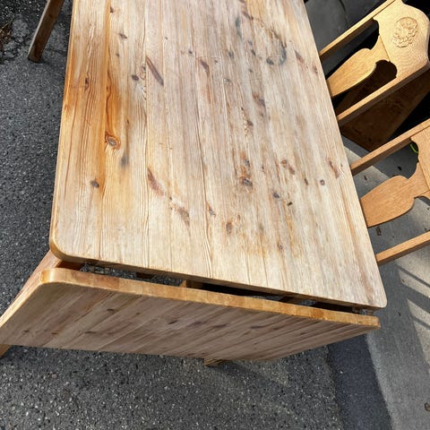 Et lite bord i massivt tre. Det har noen vannflekker som kanskje kan slipes bort. Treverket er godt bearbeidet og virker å være av god kvalitet. Bordplaten kan forlenges til en bredde på 143 cm.
