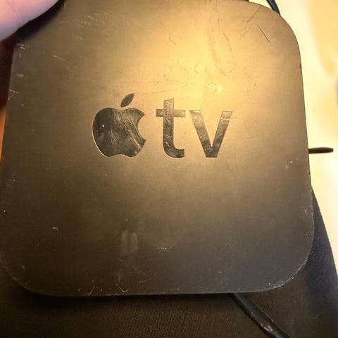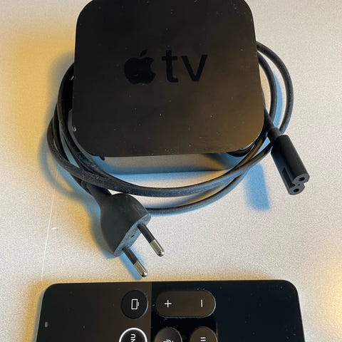 Apple TV med fjernkontroll. Mediespiller for tilkobling til TV for strømming av innhold og avspilling av media. Enheten leveres sammen med original fjernkontroll slik at menyvalg og avspilling kan styres direkte fra sofaen.