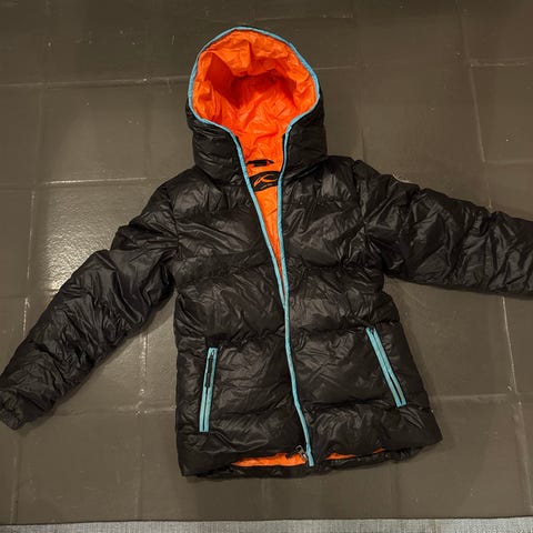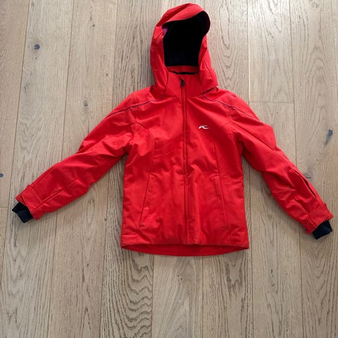 Kjus jakke for barn i størrelse 152, unisexmodell. Jakken er svart med oransje detaljer og har hette. Glidelås i front og lange ermer. Passer til allsidig bruk utendørs for barn i aktuell størrelse.