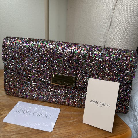Selger en autentisk Jimmy Choo-veske i sort skinn med gullfargede detaljer og dusker. Klassisk og tidløs modell som passer både til hverdag og jobb.