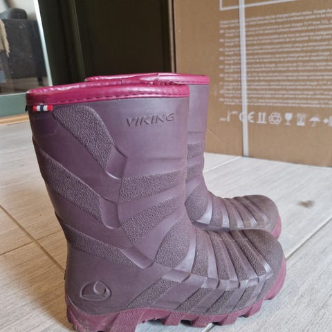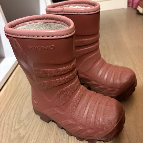 Viking støvler for barn i størrelse 35. Støvlene er rosa og egnet for jente. De har grov såle for godt grep og isolert innside som gir ekstra varme. Passer til bruk i vått og kjølig vær, for eksempel i barnehage, skole eller fritid.