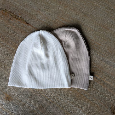 Den ene er beige med rosa striper og den andre er beige med mørkere beige striper.