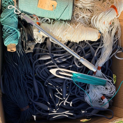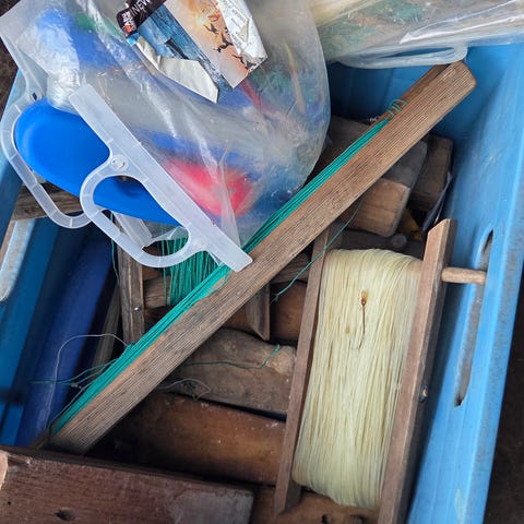 Fiskesett med pilkestikke og diverse havfisketackle. Settet inneholder blant annet pilkestikke med snelle, ferdig oppsatt snøre på treramme, sluk/pilk, opphengere og kroksett. Egner seg til isfiske og enkelt havfiske fra båt eller land. Alle deler selges samlet som vist på bildene.