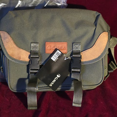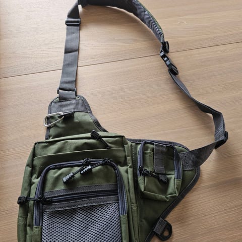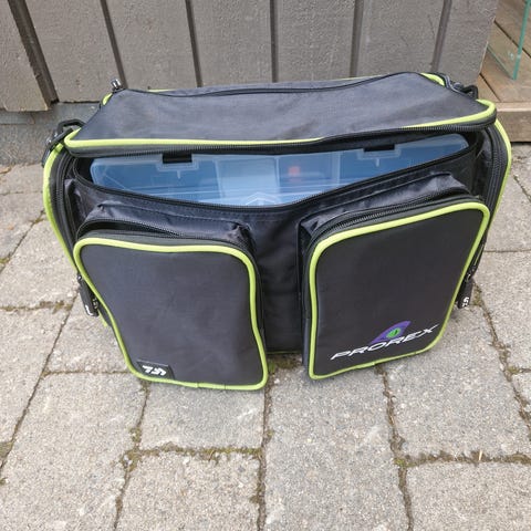 Elbe Elias skulderveske i blå tekstil. Vesken har klaff med Elias-logo, justerbar skulderreim og flere lommer med spenner og glidelås. Inneholder en vannavvisende trekk , løs " lomme " til å beskytte fiske utstyr .