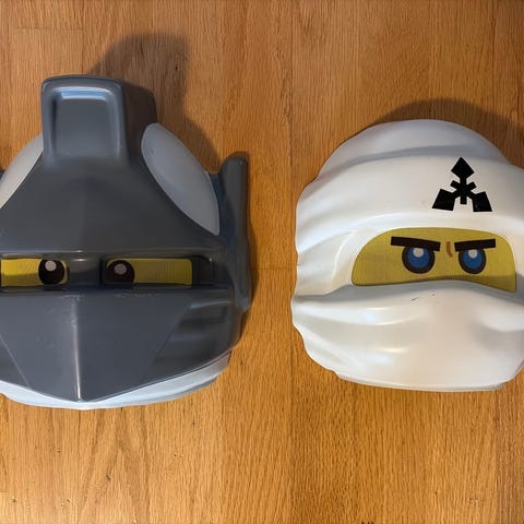 LEGO Ninjago kostyme sett for barn. Inneholder to kostymer i Ninjago-stil, ett i rødt og ett i grønt, med tilhørende masker og hansker. Passer til utkledning, karneval eller lek inspirert av LEGO Ninjago-universet. Selges for 300 kr per stykk. Kostymene er kun prøvd på 1 gang.