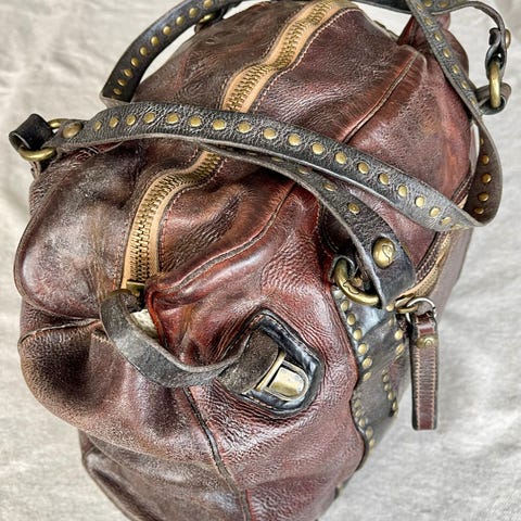 Selger en flott dameveske fra Campomaggi i kraftig, ekte skinn. Vesken har den karakteristiske vintage-patinaen som merket er kjent for, og vakre nagledetaljer på håndtakene som gir et eksklusivt og røft uttrykk.