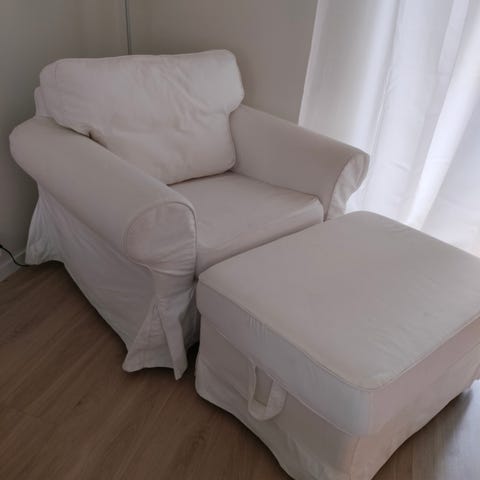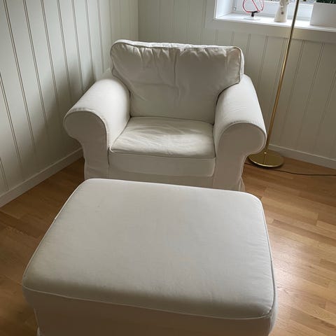 Vi selger vår gode IKEA Ektorp Lenestol inkludert tilhørende, romslig oppbevaringspuff. Dette er den hvite utgaven. Generelt lite og pent brukt, derfor flekkfri. Alle trekk kan taes av for vasking ved behov. Selges grunnet flytting.