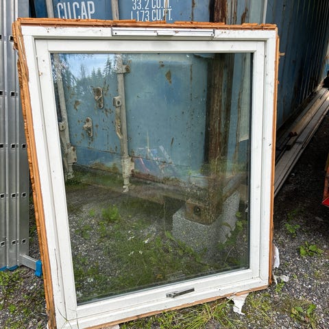 Vindu i tre med brun og hvit karm og rammer. Vinduet har to felt over hverandre med iso-glass, og er utstyrt med beslag og håndtak. Mål 139x109. Egner seg som utskiftningsvindu eller til byggeprosjekter der et vindu med treverk og brun utførelse er ønskelig.