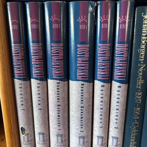 Leo Tolstoj innbundet bokserie i rød rygg. Bøkene har preget rygg med gullfarget skrift og dekorative detaljer. Serien inneholder 6 titler samlet i et sett, egnet for bokhylle og samling av klassisk litteratur.