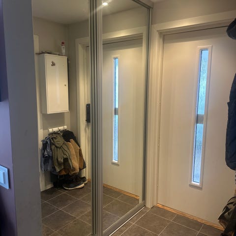 To dører på 80cm som står på skinner i tak og på gulv. Skinnene er 158 cm.