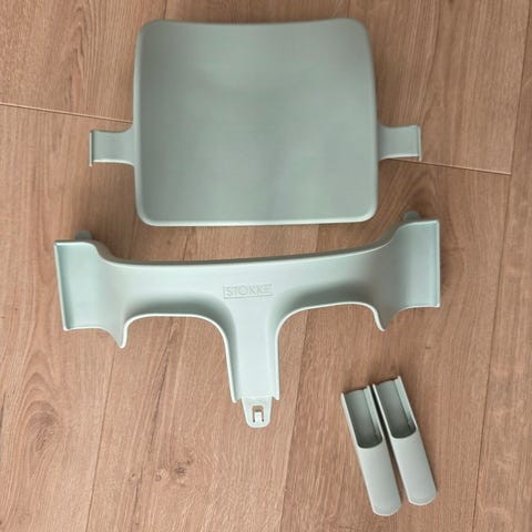 Stokke Tripp Trapp tilbehør sett i grå farge. Settet består av bordplate, bøyle/frontbøyle, ryggplate og to feste-/monteringsdeler, samt fempunkts sele i tekstil. Delene er beregnet for bruk sammen med Stokke Tripp Trapp-stol for å gi støtte og sikring av barn under måltider og annen sittebruk. Materiale er hovedsakelig plast på brett og bøyler, og tekstil med plastspenner på selen.