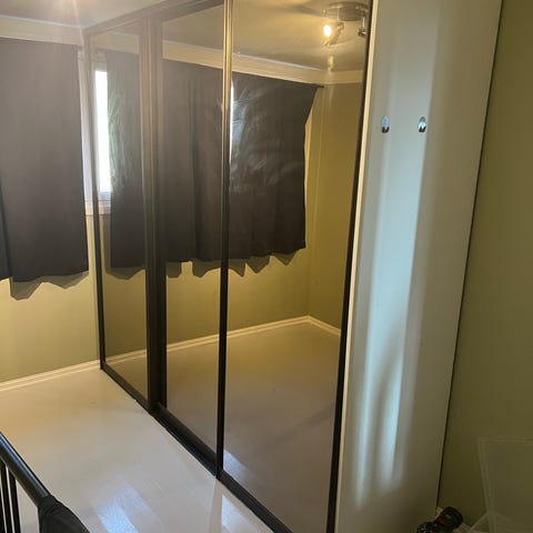 Pax skap fra IKEA i fargen brunsvart med speildører. Uttrekkbar hylle med innsats til smykker, 3 kurver, 3 skuffer, hyller og hengeplass.