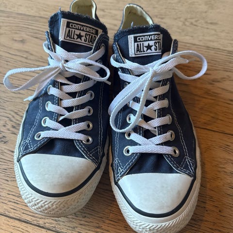 Converse All Star sneakers i størrelse 38. Modellen er lave canvas-sko med snøring og gummisåle. Skoene er blå med hvite lisser og hvit tå- og sålekant. Egner seg som fritidssko til hverdagsbruk. Litt store i str.