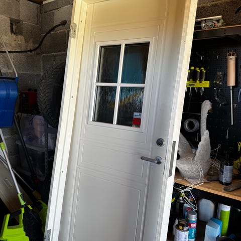 Ytterdør med glassfelt i øvre del og tett felt nederst. Døren er hvitmalt og har integrert vindu med karm. Passer som terrassedør der det er behov for lysinnslipp gjennom glassrute.