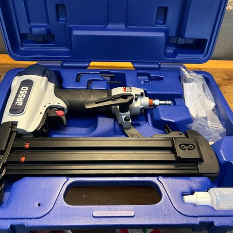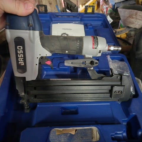 Basso spikerpistol i plastkoffert. Luftdrevet verktøy egnet for spikring og festearbeid i tre og lignende materialer. Leveres i hard plastkoffert for oppbevaring og transport.