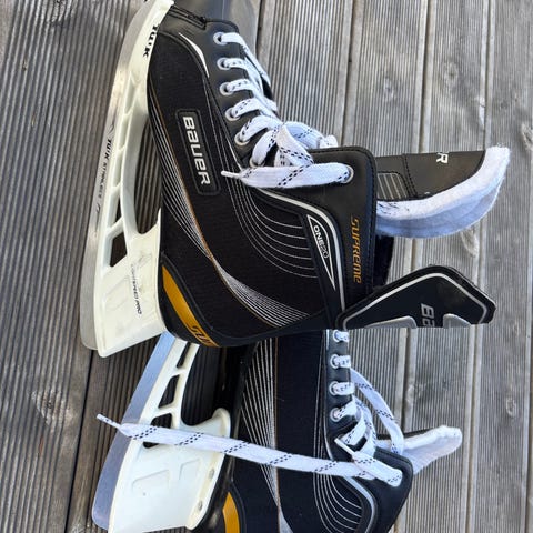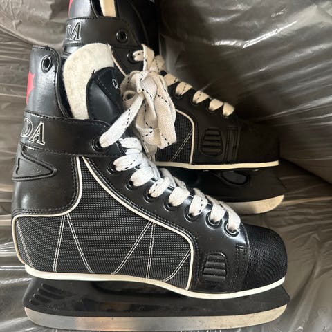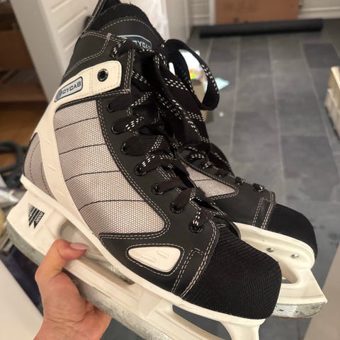 Ishockeyskøyter i størrelse 44 i svart og hvit farge. Skøytene har snøring foran, polstret ankelparti og stålklinge tilpasset ishockeybruk. Egner seg for bruk på isbaner til trening og fritidsbruk.