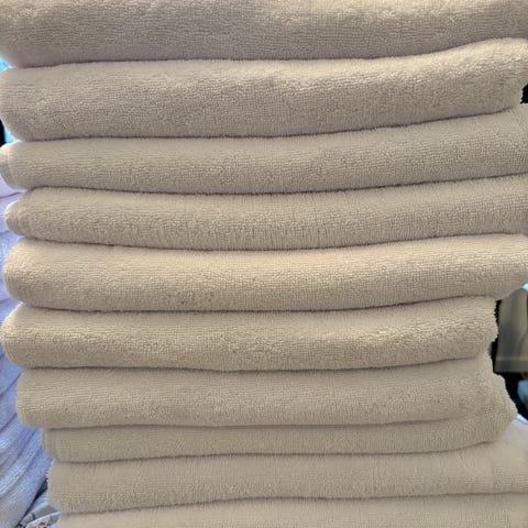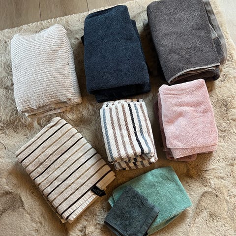 Lexington håndklær i størrelsen 70x130 og 50x70. fargen dusty olive og lysegrå.