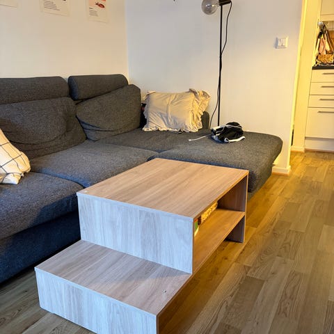 Sofabordet har rektangulær bordplate som kan heves, noe som gir en praktisk arbeids- eller spiseflate foran sofaen. Under den hevbare platen er det et stort oppbevaringsrom I underdelen er det en åpen hylle som gir ekstra lagringsplass.