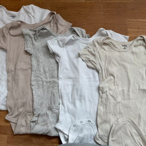 Nøytral klespakke med 8 bodyer og en bukse i str. 68.