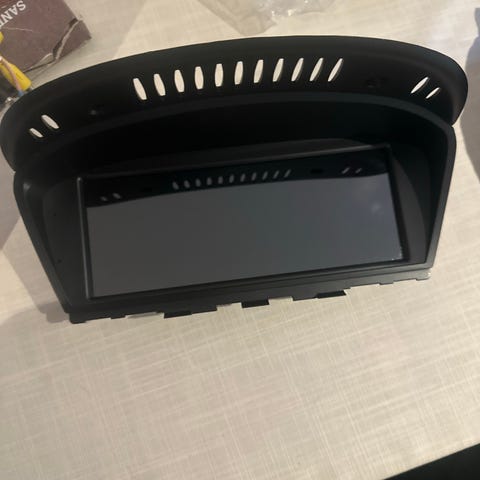 BMW skjerm med delenummer BM 9322120 10R. Enheten har integrert metallfeste og tilkoblingspunkter på baksiden for montering i bilens dashbord. Passer til BMW-modeller som bruker dette delenummeret. Sjekk delenummer og kompatibilitet mot egen bil før bruk.