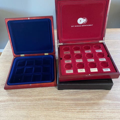 Collectors’ Line myntkassetter, myntskrin, myntboks, presentasjonskassett i møbelkvalitet med magnetlåslukking. Myntbrett med 12 rammer a 50 mm kvadrat. Skrinet er 29 cm bred, 25,5 cm dyp og 5 cm høy. Finnpris er for begge. Se bilder for detaljer.