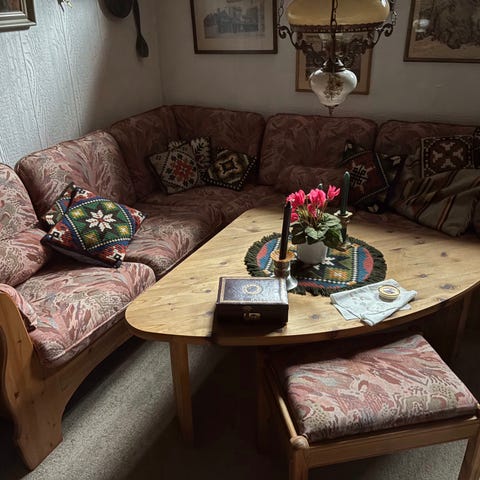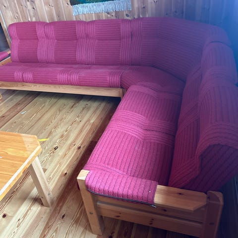 Eldre hjørnesofa med tilhørende bord