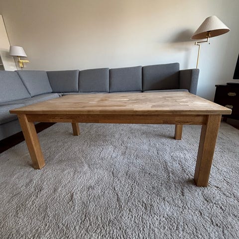 Selger et meget stødig og flott salongbord i heltre eik. Bordet har en klassisk åttekantet form og et tidløst design som passer like godt i stua som på hytta. Siden bordet er i heltre, er det svært tungt og stabilt.