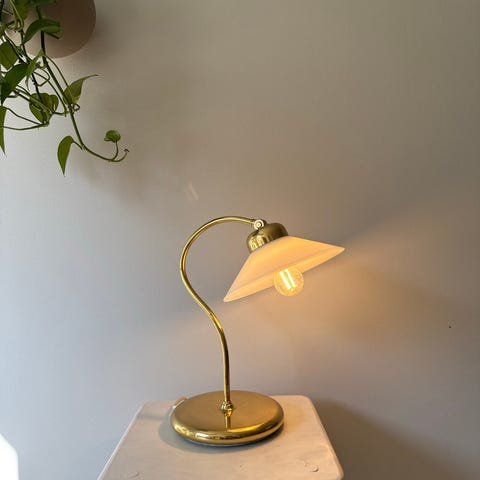 Nydelig liten skomakerlampe med hvit glassskjerm søker nytt hjem.