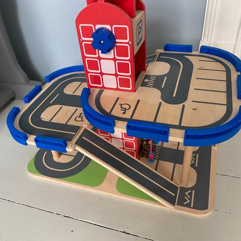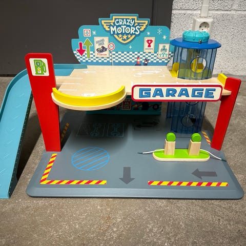 Et flott og solid parkeringshus for barn. Garasjen er fra kvalitetsmerket LeToyVan. Den er laget av tre og malt i rødt og gult og består av 2 etasjer, 2 «spiral-ramper» og 1 heis. En bil og 1 sett med klistremerker til å pynte garasjen følger med. Parkeringshuset passer sammen med de fleste lekebiler, deriblant de flotte trebilene til Le Toy Van.