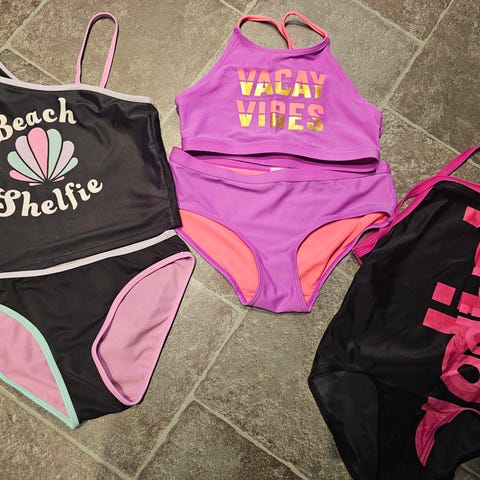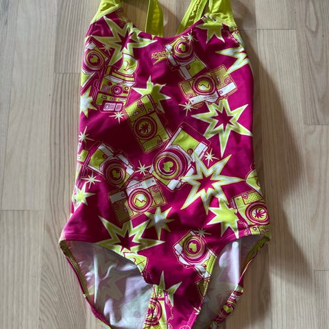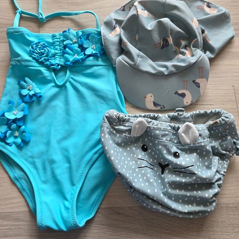 H&M badedrakt for barn i størrelse 146-152. To badedrakter beregnet for svømming. Den ene er mintgrønn med hvite prikker og volangkant øverst, den andre har palmemotiv i toner av mintgrønn, rosa og svart med volangdetalj i halsen. Begge har smale skulderstropper og er laget i elastisk materiale med innhold av polyester og elastan, egnet for bruk i basseng og på strand.