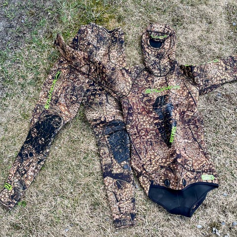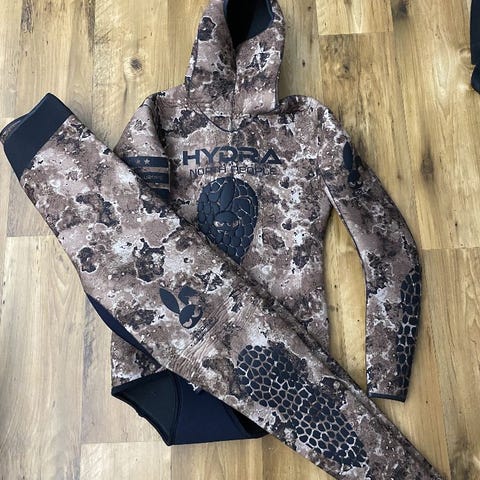 Frivannsliv dykkerutstyr sett i neopren med kamuflasjemønster. Settet omfatter fridykkerdrakt 7mm med hette og forsterkninger på bryst og knær, ermeløs overdel i tilsvarende kamuflasje, samt lange svømmeføtter med åpen hæl. I tillegg følger det med neoprenhansker og neoprenstøvler i svart. Det er også med en harpun fra Frivannsliv med gummistrikk. Utstyret er egnet til fridykking og undervannsjakt i kaldt vann, der kamuflasjemønsteret bidrar til å bryte opp konturene i sjøen og neoprenmaterialet gir isolasjon. Settet gir en grunnpakke med drakter og finner