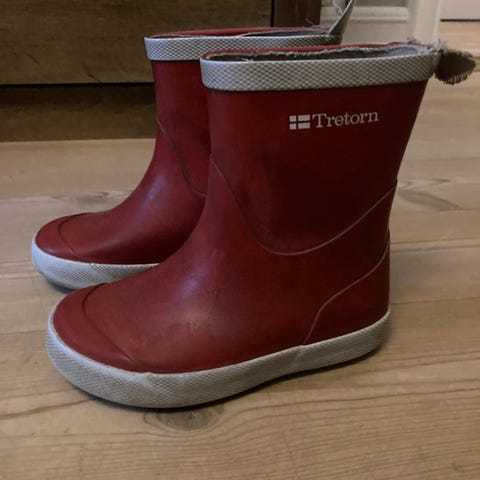 Tretorn gummistøvler for jente i størrelse 23. Støvlene har rosa og mørkeblå overdel med lys kant øverst. De er laget i vanntett materiale med glatt innside. Passer til bruk i regnvær og vått underlag for barn som bruker sko i størrelse 23.
