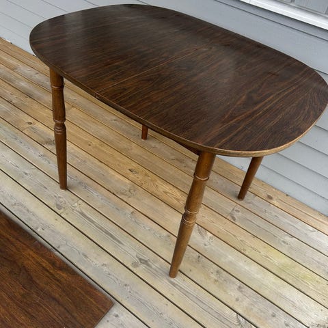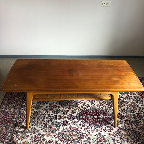 Dette er et teakbord av typen sofabord eller et mindre spisebord, sannsynligvis fra midten av det 20. århundre. Utrekksbare sideklaffer som gjør bordet vesentlig større. Kan trenge litt kjærlig pussing og kanskje lakk. Fullt brukbart. Må hentes i Skudeneshavn snarest. Gi gjerne bud.