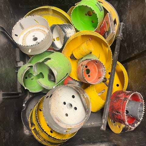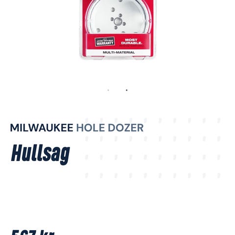 Selger et parti brukte hullsager i ulike dimensjoner. Flere av de større er fra Milwaukee Hole Dozer-serien, som er solide hullsager beregnet for tre, gips og lettere metall. Settet inneholder flere størrelser, blant annet rundt 44 mm og 46 mm, samt flere større hullsager.
