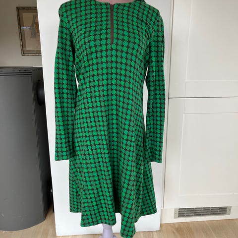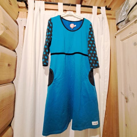 Pen kjole fra det norske designet KO:KO selges. Den har glidelås i siden og belte som kan tas av. Fine detaljer nederst på ermene og foran, med knapper trukket med stoff. Kjolen er litt liten i størrelsen, særlig over bysten. Fasongen er smal og figursydd.