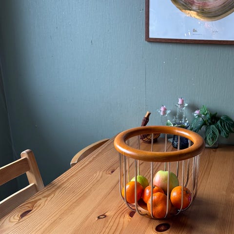 retro brødkurv, grønn brødkurv, brødkurv i tre, trekurv, treboks, serveringskurv, dekorativ kurv, 70-talls, vintage, retro kjøkken, nostalgi, landlig stil, med hjerter, utskåret tre, grønnmalt tre, håndlaget, håndverk, fruktkurv, oppbevaring kjøkken, servering, interiør dekor, kjøkkeninteriør, vintage dekor