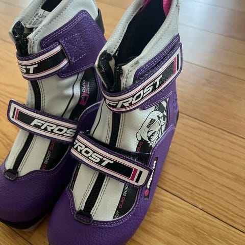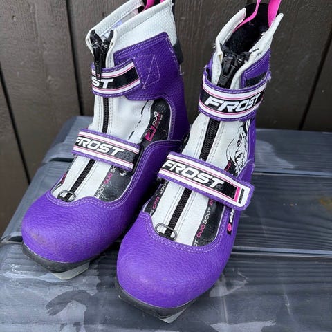 Frost langrennsstøvler i lilla og hvit farge. Støvlene har borrelåsstropper over vristen og skaftet for bedre tilpasning og støtte. Overdelen er i syntetisk materiale med forsterkninger i front og hæl. Passer til NNN-binding. Str 32. Kan sendes.