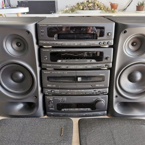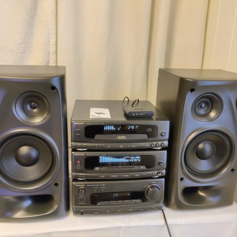 JVC MX-D75TR stereoanlegg fra 1990-tallet Anlegget består av flere moduler med FM radio, dobbel kassettspiller, CD-spiller med 3*veksler og fjernkontroll. Høyttalerne er JVC SP-D7 med oppgitt effekt på inntil 100 watt og impedans på 6 ohm. På baksiden finnes tilkoblinger for blant annet eksterne lydkilder via RCA-innganger. Stereopakken er egnet for avspilling av radio, CD og kassett, og kan kobles til andre lydkilder via tilgjengelige innganger. Bruksanvisning medfølger. Alle komponenter virker, kasettavspilling er ikke testet i mangel på sådan.