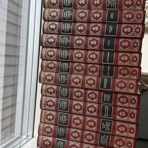 Bøkene har et klassisk utseende med skinnbind og framstår som nye.