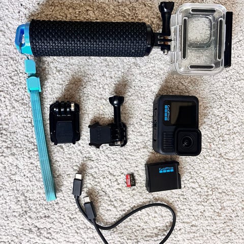 Pakken inneholder et GoPro Hero 6, samt flere tilbehørsdeler. På bildene vises blant annet flytehåndtak, kamerahus/ramme, feste med skrue og selvklebende fester. Kameraet har skjermmeny som viser opptaksinnstillinger som oppløsning og bildefrekvens.