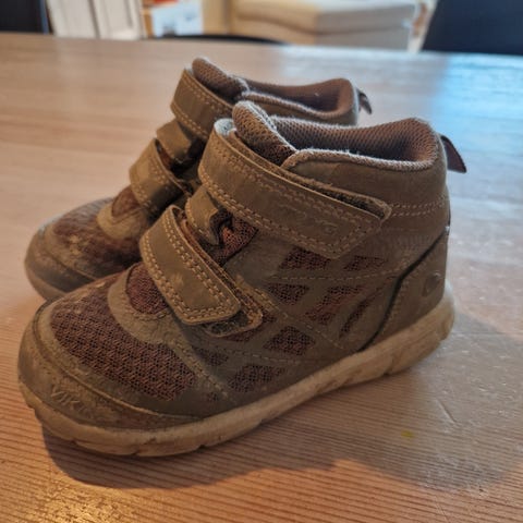 Viking Veme GTX i str 26 gis bort mot henting. De er kun brukt en sesong. De kan vaskes i vaskemaskin. Fronten på den ene skoen er noe slitt, ellers er de like hel.