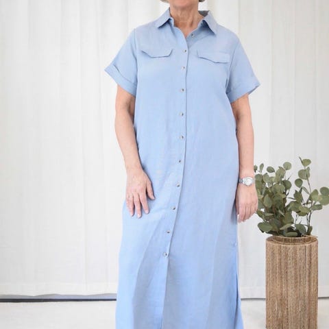 HÉST hverdagskjole i lin for dame i størrelse S. Kjolen er blå og har et avslappet snitt. Den har lange ermer med strikkdetalj nederst og knyting i halsen. Laget i lin, som gir et lett og luftig uttrykk egnet til hverdagsbruk. Passer som enkel kjole alene eller sammen med andre plagg etter behov.