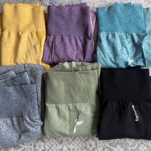 Tightsene er brukt, utenom den ene Gymshark tightsen (nederst til venstre på bildet).