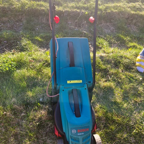 Bosch gressklipper elektrisk i grønn farge. Enheten drives med strøm via ledning og har håndtak med betjeningsknapp øverst. Fronten har åpning for lufting og fjerning av mose i plenen. På bildene vises også en oppsamlingsboks som kan monteres foran for å samle opp rusk fra plenen. Passer til lufting og vedlikehold av plen i hageområder der man har tilgang til strømuttak.