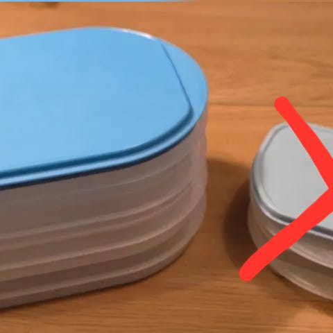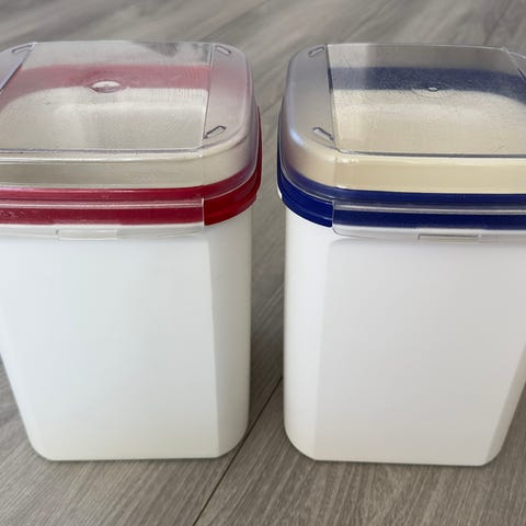To ulike størrelser, én rommer ca 4 liter, én rommer ca 2,6 liter. Henholdsvis 20,5 cm og 15 cm høyde. Fine til mel og lignende.