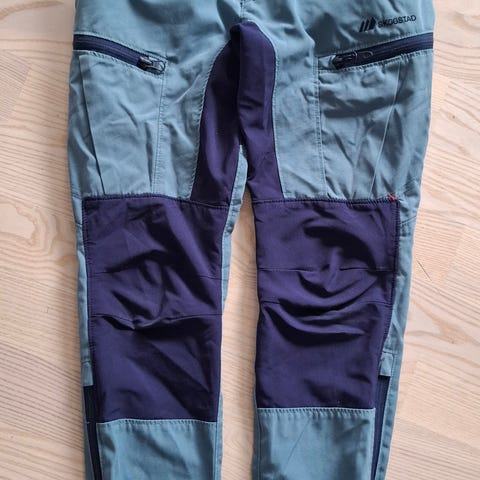 Buksen er blå med mørke forsterkningsfelt på knær og sete. Materialet er hovedsakelig polyester, med slitesterke partier i kontrastfarge. Modellen har strikk og justering i livet, samt glidelåslommer foran.